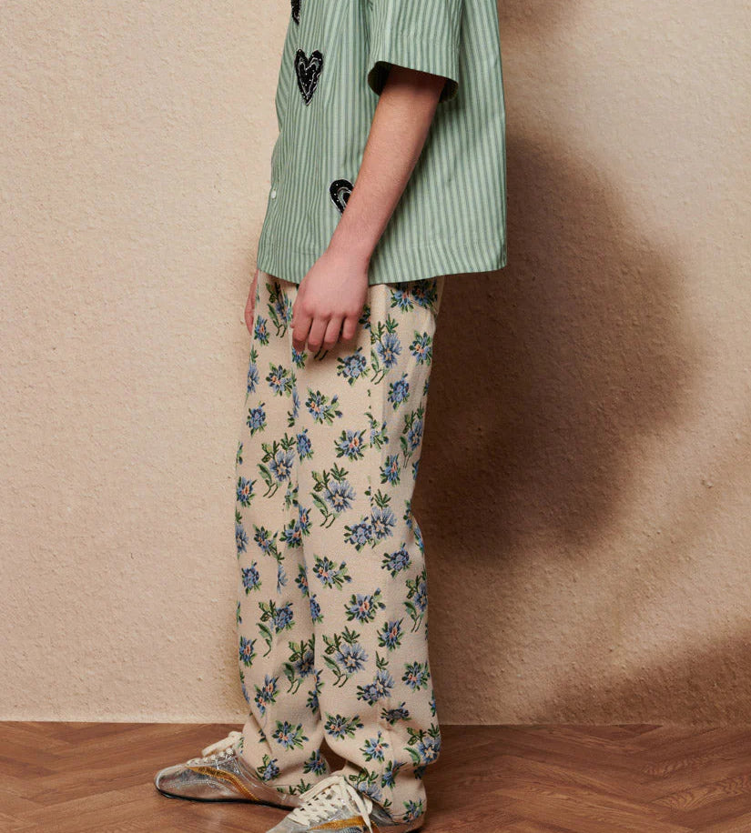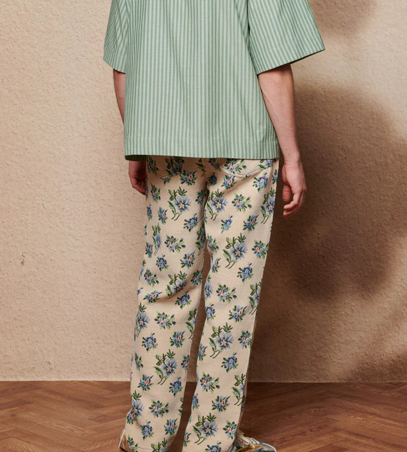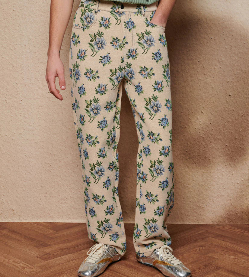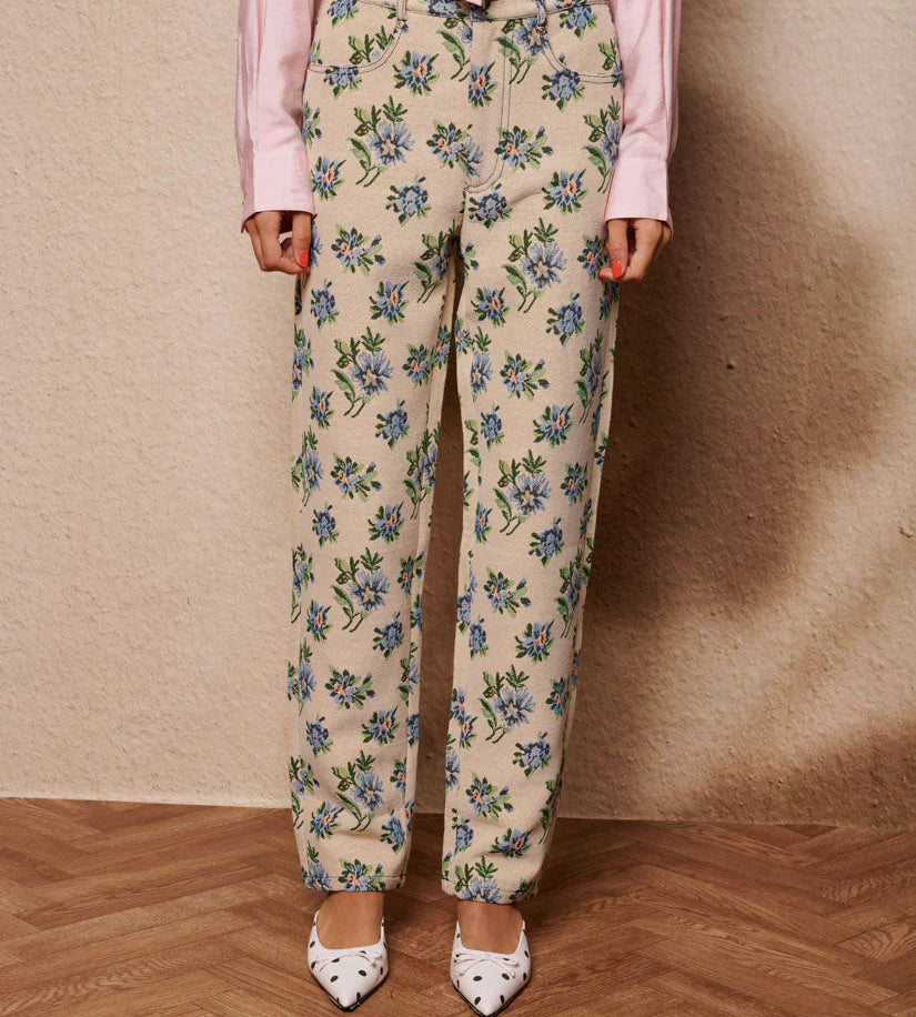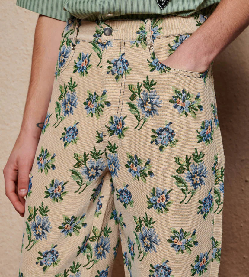 Tiesaus silueto džinsai iš gėlių tapiserinio audinio. Kontrastingos siūlės, keturios kišenės. Detalės: sidabrinės kniedės ir sidabrinis mygtukas užsegimui.