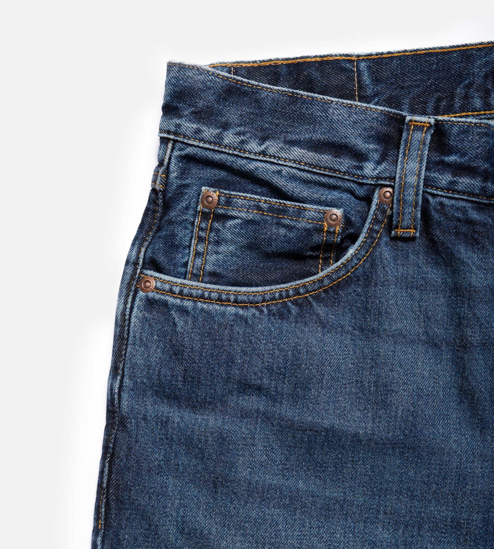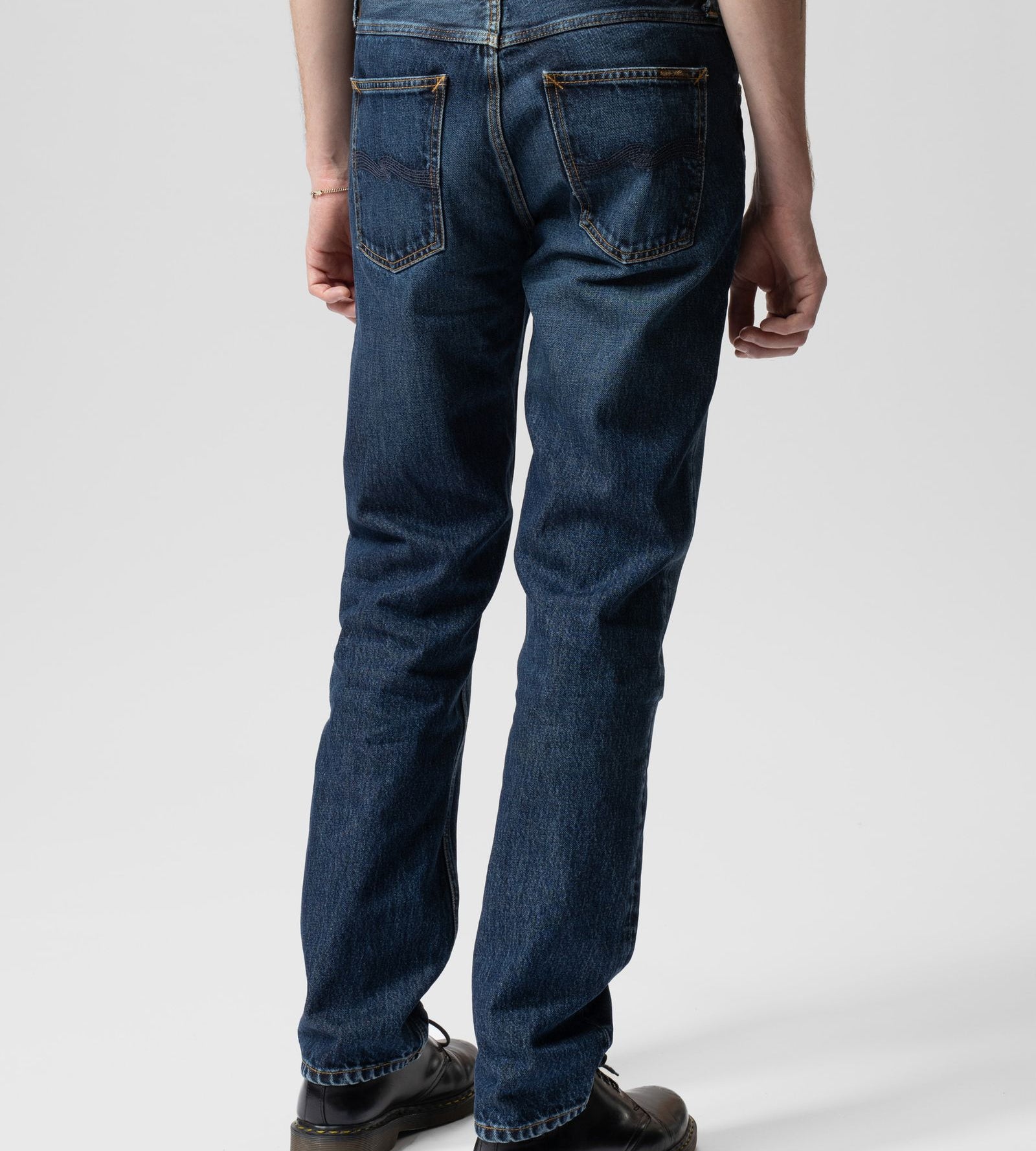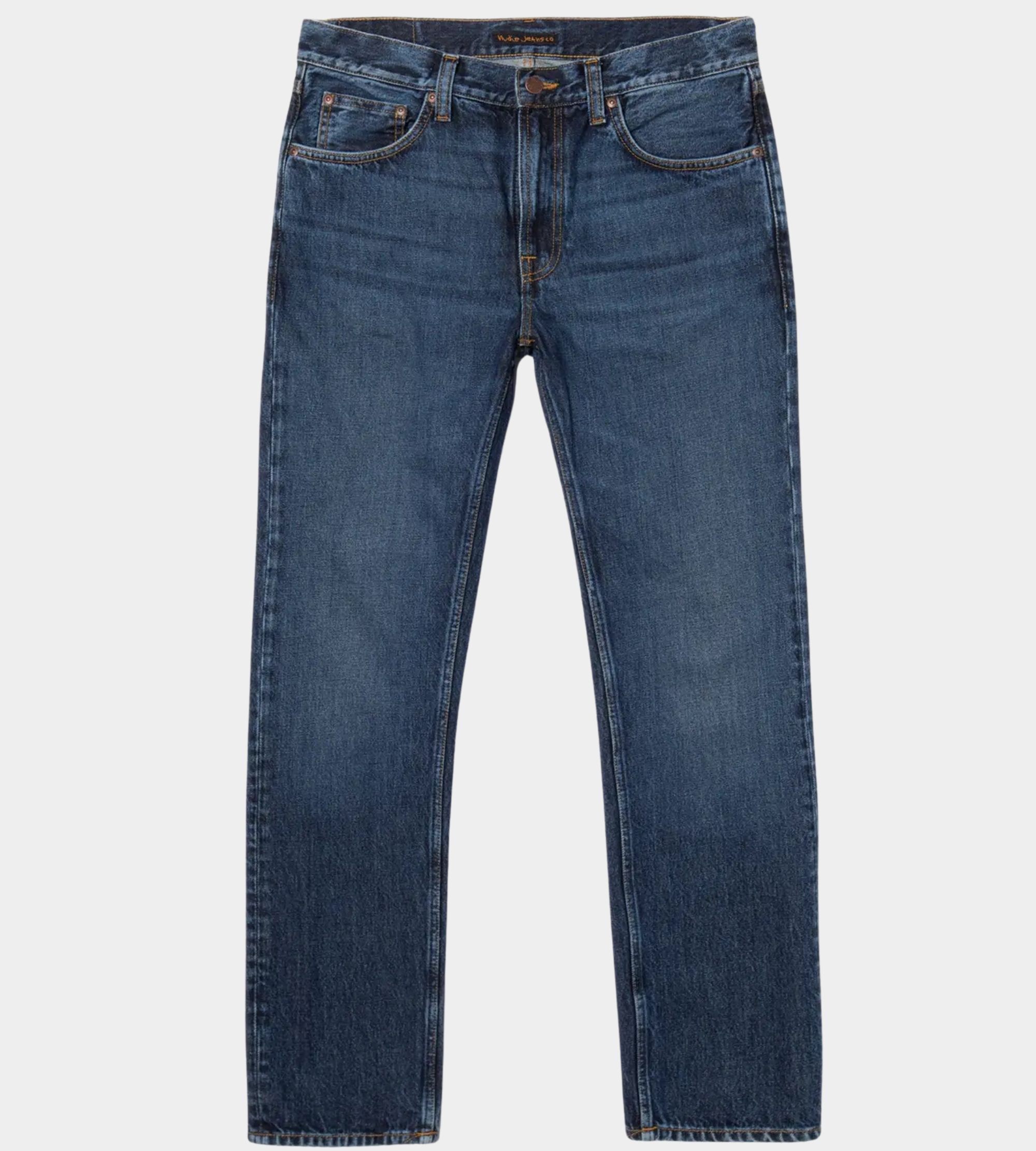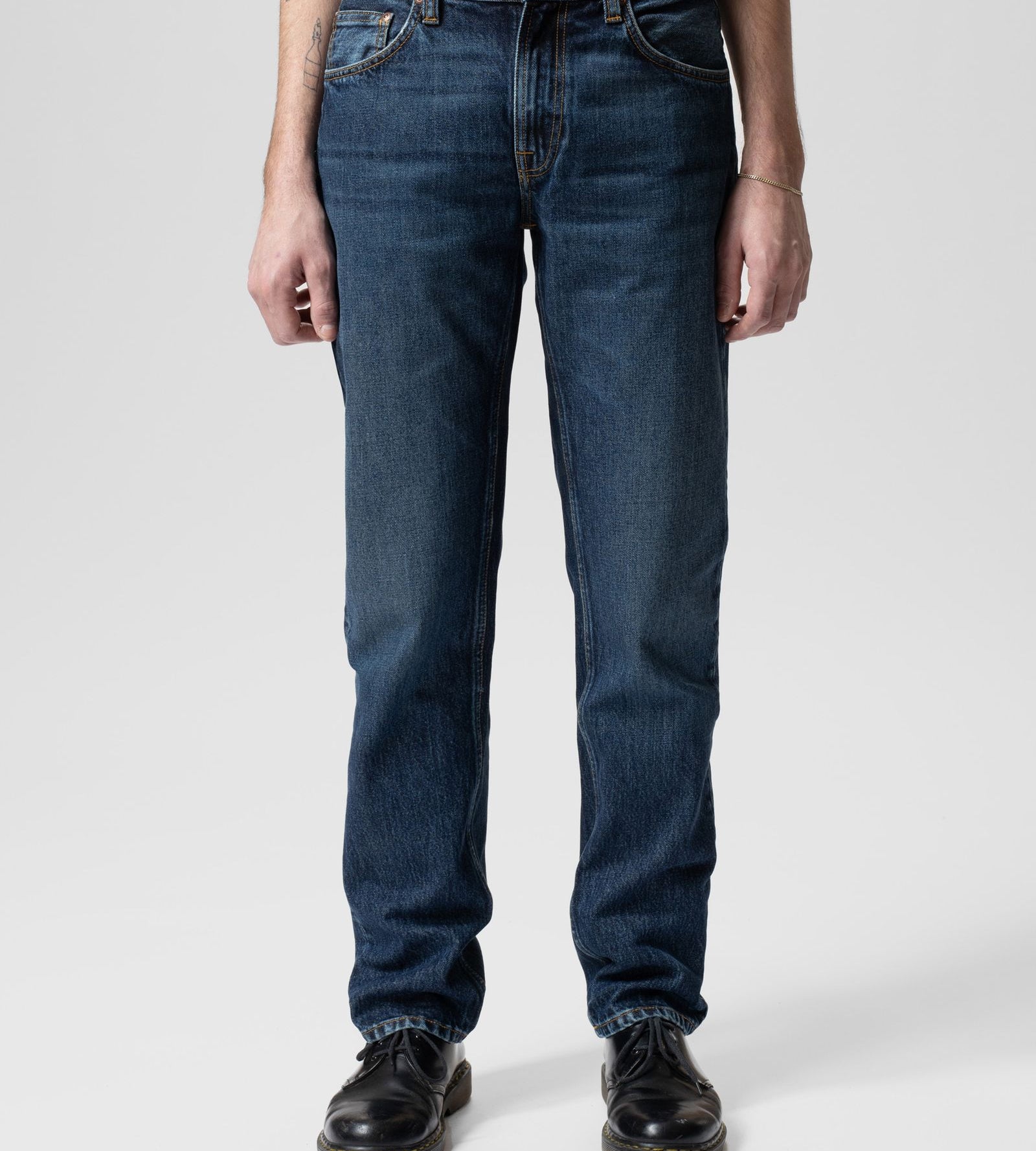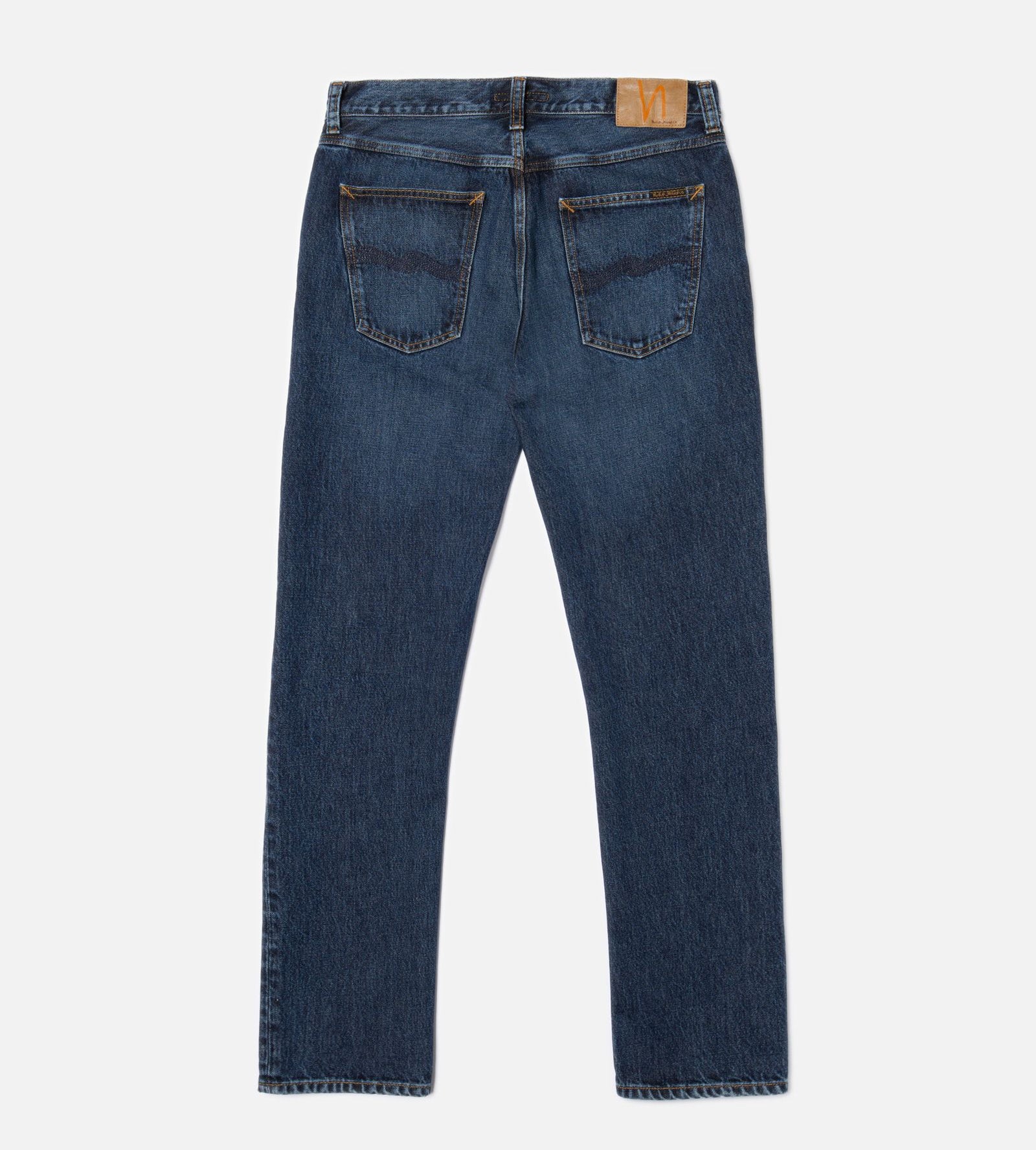 Tiesaus kirpimo „regular fit“ džinsai su tiesiomis klešnėmis, tamsiai mėlynos spalvos ir lengvais sendinimo akcentais. Nors spalva gili, džinsai turi visą indigo atspalvių paletę – nuo labai tamsių iki švelniai pašviesėjusių mėlynos tonų.